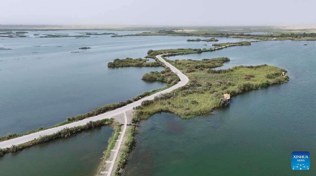A drone photo taken on Aug. 10, 2025 shows the Manas national wetland park in Manas County, Changji Hui Autonomous Prefecture, northwest China's Xinjiang Uygur Autonomous Region. In Xinjiang, new wetlands such as the Manas national wetland park and the Lalikun wetland nature reserve have emerged near the border of Gurbantunggut Desert and Taklimakan Desert, acting as important ecological shelters for migrant birds and safeguarding the biodiversity and oases in the region. (Xinhua/Zhou Jiayi)