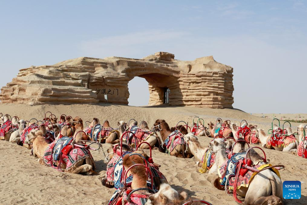 Camels are pictured at the "desert gate" scenic area in Alaer, northwest China's Xinjiang Uygur Autonomous Region, Aug. 12, 2025. The "desert gate" scenic area, covering an area of 14 hectares, receives an average of 600,000 visits annually. (Xinhua/Liu Jiaqi)