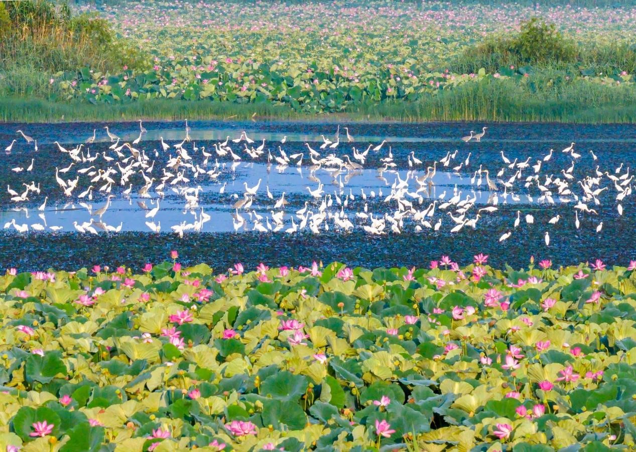 Egrets forage and rest in a wetland in Suqian, east China's Jiangsu province, Aug. 4, 2025. (Photo/Zhang Lianhua)