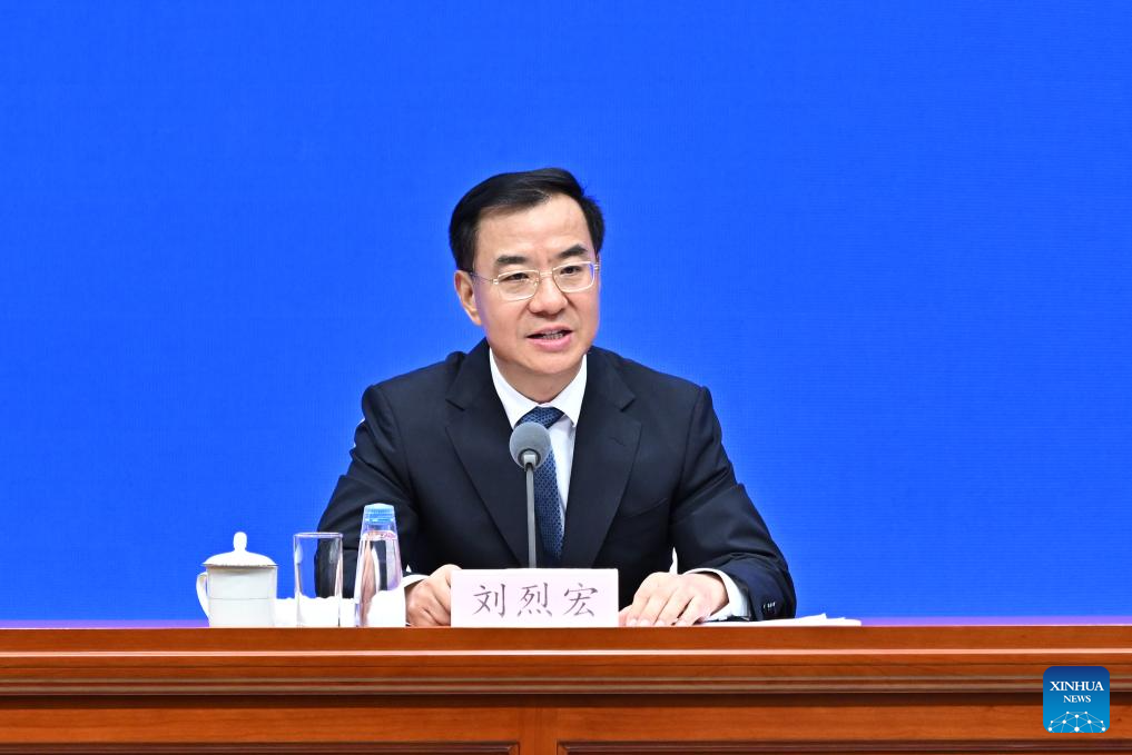 Liu Liehong, a member of the Communist Party of China Leadership Group of the National Development and Reform Commission and head of the National Data Administration (NDA), speaks during a press conference held by the State Council Information Office (SCIO) on achievements in Digital China development during the 14th Five-Year Plan period (2021-2025) in Beijing, capital of China, Aug. 14, 2025. Liu and NDA deputy heads Shen Zhulin, Chen Ronghui and Xia Bing attended the press conference in Beijing on Thursday. (Xinhua/Li Xin)