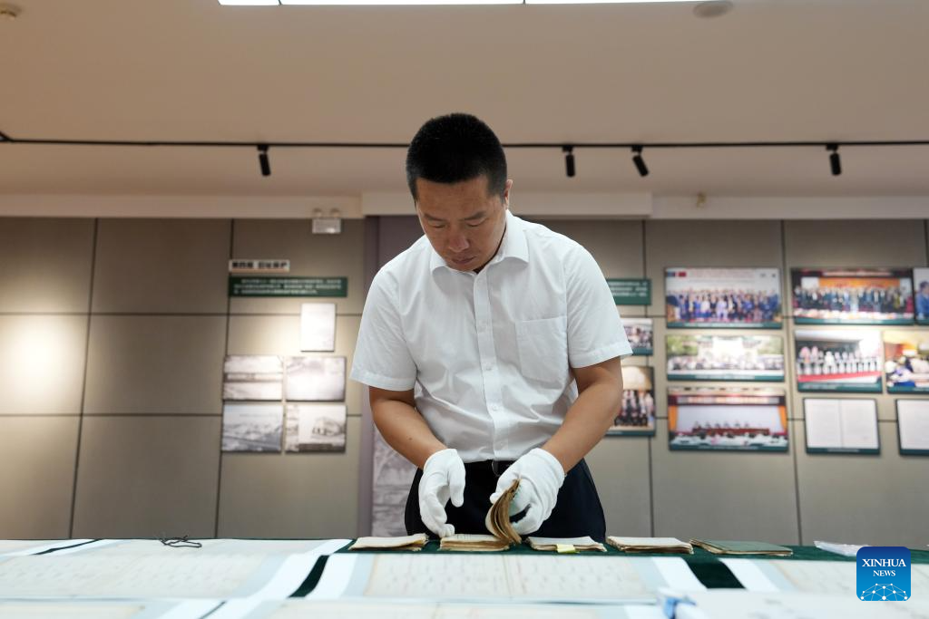 Jin Shicheng, a researcher with the Exhibition Hall of Evidences of Crime Committed by Unit 731 of the Japanese Imperial Army, puts the new evidence of Unit 731 in place at the hall in Harbin, northeast China's Heilongjiang Province, Aug. 13, 2025.