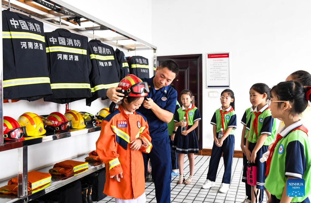 A child tries firefighting gears at a fire and rescue station in Jiyuan City, central China's Henan Province, Aug. 16, 2025. (Photo by Miao Qiunao/Xinhua)