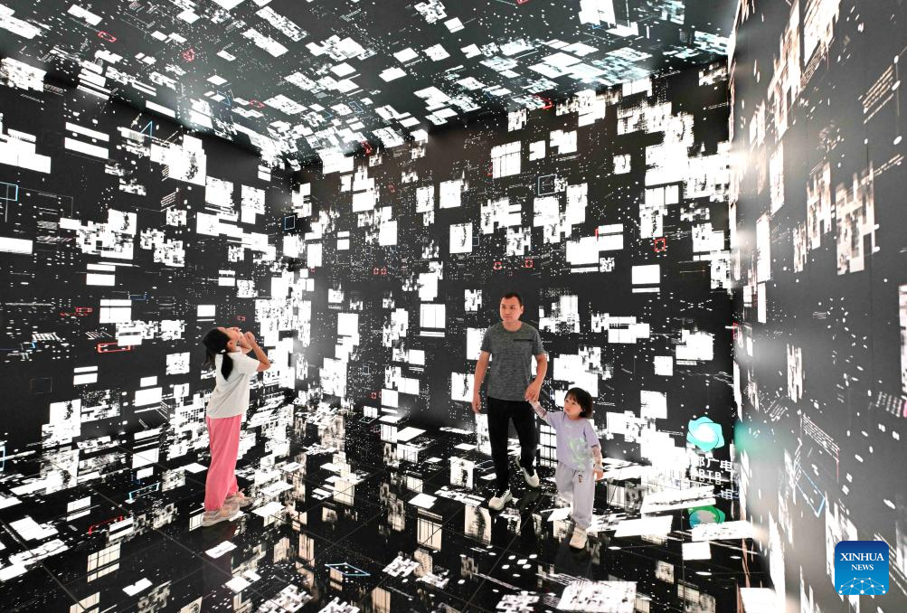 Children experience "immersive reading" at a library in Zhengding County of Shijiazhuang City, north China's Hebei Province, Aug. 16, 2025. (Photo by Chen Qibao/Xinhua)