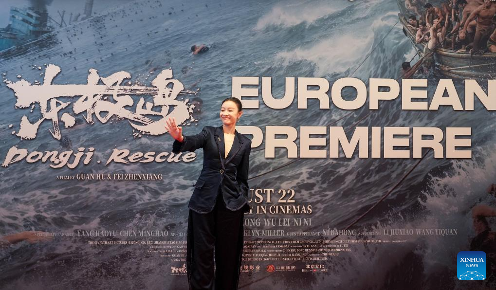 Chinese actress Ni Ni waves during the European premiere of the film Dongji Rescue, in London, Britain, Aug. 15, 2025. Dongji Rescue tells the story of how Chinese fishermen risked their lives to rescue over 300 British prisoners of war from the Japanese ship Lisbon Maru in 1942. The European premiere of the film opened Friday night in London. (Xinhua/Wu Lu)