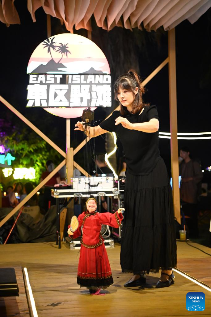 Actress Wu Xiaohui performs a marionette drama in Quanzhou City, southeast China's Fujian Province, Aug. 18, 2025. In Quanzhou City of Fujian Province, a 6-kilometer "Coastal Romance Route" stretches from Zhenwu Temple to the picturesque Xunpu Village. The coastal route, comprising five commercial districts, seven tourist attractions and over 200 distinctive restaurants, offers a vibrant cultural and tourism experience for both tourists and residents. (Xinhua/Xiao Xiao)