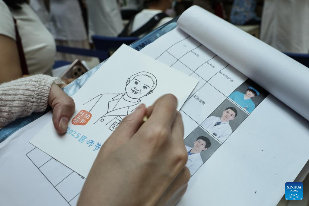A volunteer draws a personalized cartoon picture for a doctor during a free clinic event in Beijing, capital of China, Aug. 19, 2025. Peking Union Medical College Hospital (PUMCH) held a free clinic event here on Tuesday to mark the eighth Doctors' Day. More than 50 medical staff representatives provided on-site health consultations to patients. Meanwhile, hospital volunteers drew personalized cartoon pictures for the participating medical personnel.