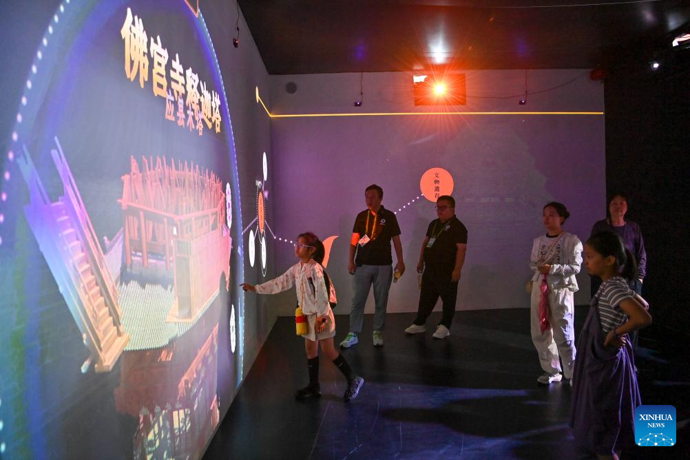 A child uses a VR device to view Jinci Temple at the 7th Shanxi Cultural Industries Fair in Taiyuan, north China's Shanxi Province, Aug. 21, 2025. The fair kicked off here on Thursday and will last till Aug. 25, attracting about 2,000 exhibitors from over 30 countries and regions worldwide. (Xinhua/Yang Chenguang)