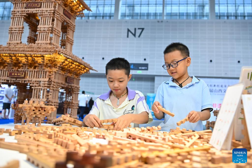 Children play toys based on Sunmao, or Chinese joints, a traditional Chinese method of connecting wood, at the 7th Shanxi Cultural Industries Fair in Taiyuan, north China's Shanxi Province, Aug. 21, 2025. The fair kicked off here on Thursday and will last till Aug. 25, attracting about 2,000 exhibitors from over 30 countries and regions worldwide. (Xinhua/Yang Chenguang)