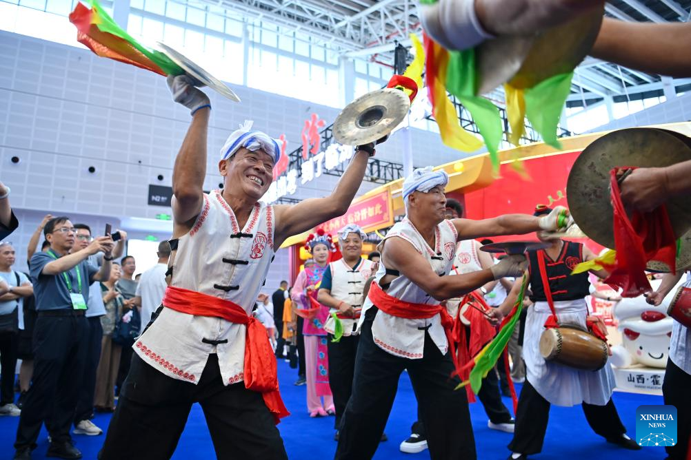 Actors perform at the 7th Shanxi Cultural Industries Fair in Taiyuan, north China's Shanxi Province, Aug. 21, 2025. The fair kicked off here on Thursday and will last till Aug. 25, attracting about 2,000 exhibitors from over 30 countries and regions worldwide. (Xinhua/Yang Chenguang)