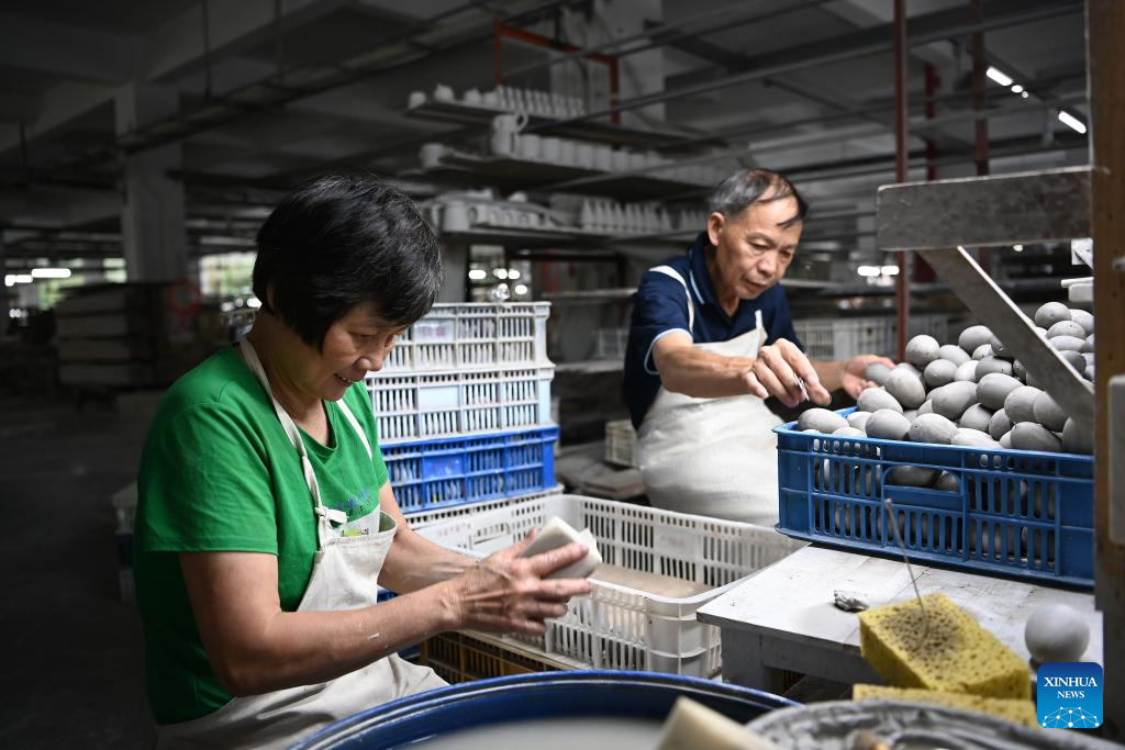 A worker is pictured at a workshop of Quanzhou Shunmei Group Co., Ltd. in Dehua County, southeast China's Fujian Province, Aug. 20, 2025. Dehua, a county with centuries of ceramic-making history and famed for its white porcelain, is home to over 4,500 ceramic-making enterprises, selling products to more than 190 countries and regions worldwide. To promote Dehua ceramics, the county has established 54 exhibition centers in Belt and Road partner countries and key cities. From January to July this year, the county's ceramic exports has exceeded 2.138 billion yuan (about 297.9 million U.S. dollars) and the ceramic industry cluster has reached a scale of 41.61 billion yuan (about 5.797 billion U.S. dollars), representing a 5.06 percent and 6.8 percent year-on-year increase respectively. (Xinhua/Lin Shanchuan)