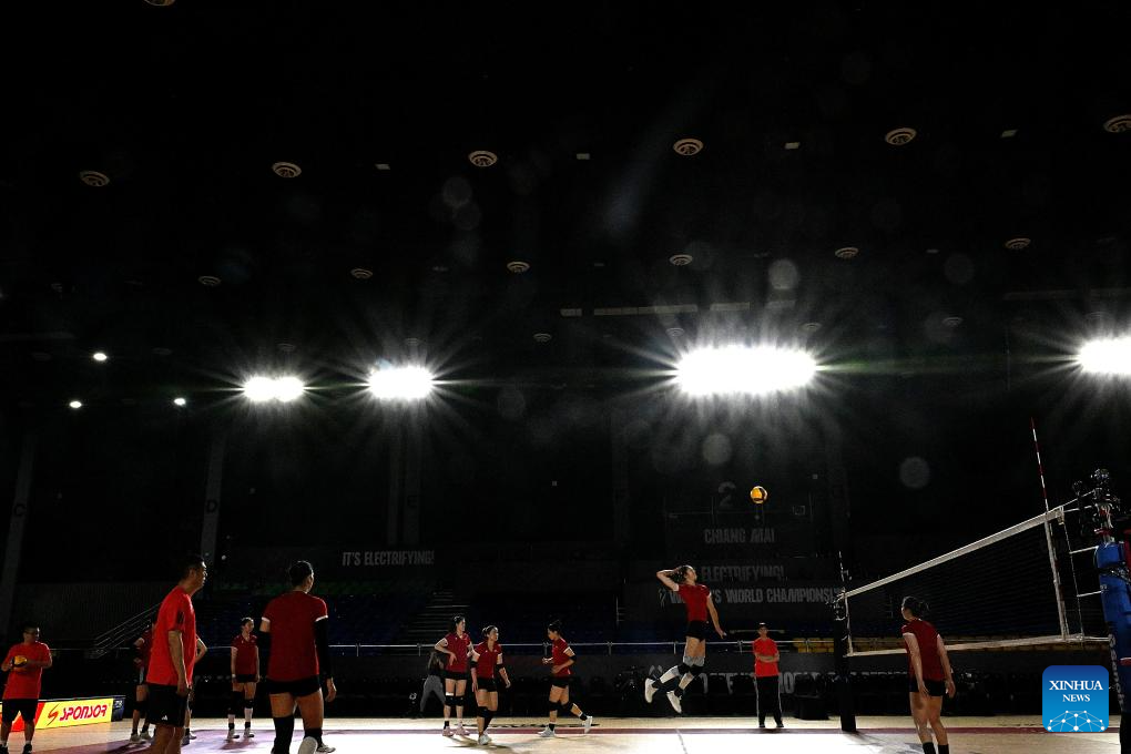 Players of team China take part in a training session ahead of the FIVB Women's Volleyball World Championship in Chiang Mai, Thailand, Aug. 21, 2025. (Xinhua/Hou Zhaokang)