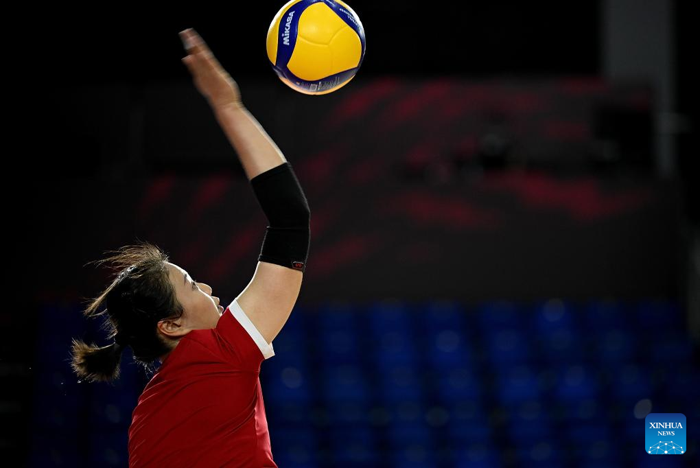 Wang Mengjie of team China reacts during a training session ahead of the FIVB Women's Volleyball World Championship in Chiang Mai, Thailand, Aug. 21, 2025. (Xinhua/Hou Zhaokang)