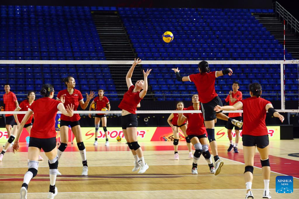 Players of team China take part in a training session ahead of the FIVB Women's Volleyball World Championship in Chiang Mai, Thailand, Aug. 21, 2025. (Xinhua/Sun Weitong)