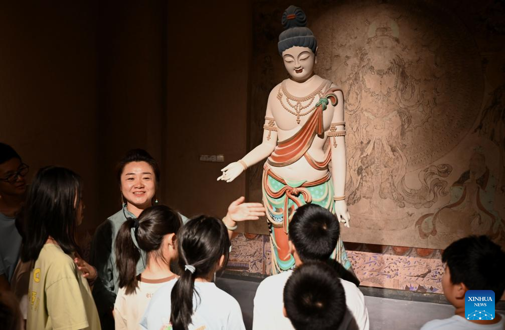 Children learn about Dunhuang colored sculptures at an art gallery in Dunhuang, northwest China's Gansu Province, Aug. 22, 2025. Children participate in various activities during summer vacation across the country. (Photo by Zhang Xiaoliang/Xinhua)
