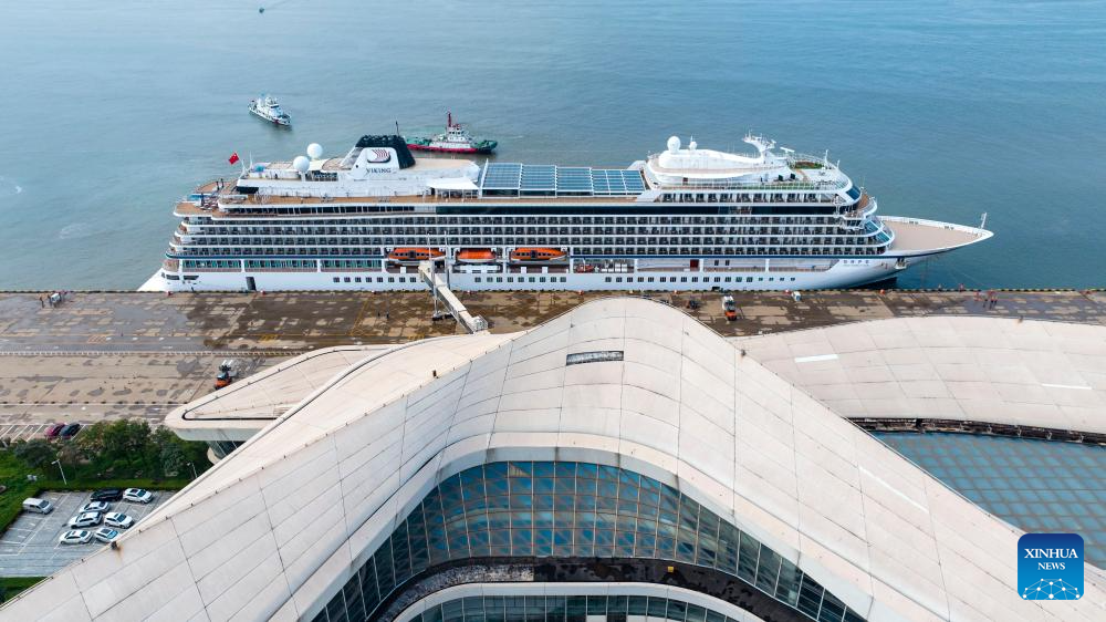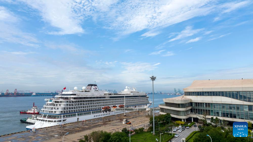 A drone photo taken on Aug. 22, 2025 shows cruise ship Zhao Shang Yi Dun docking at the Tianjin International Cruise Home Port in Tianjin, north China. The cruise ship Zhao Shang Yi Dun arrived in Tianjin for the first time on Friday since commencing official operations. (Xinhua/Zhao Zishuo)