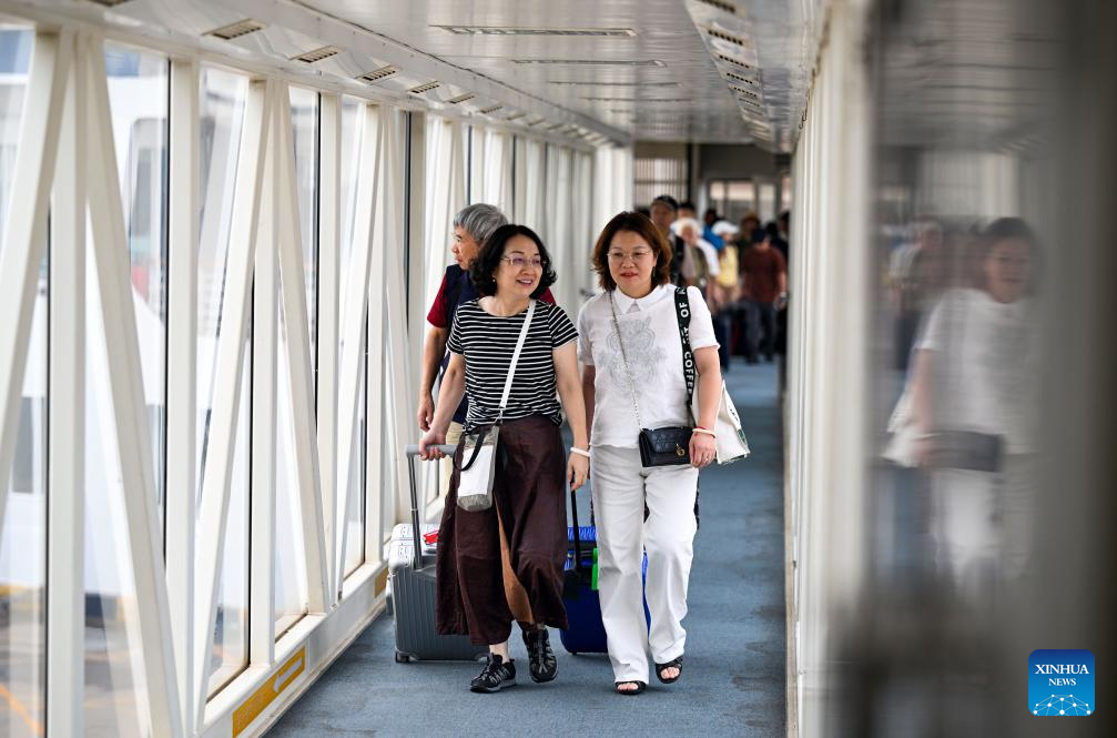 Tourists disembark from the cruise ship Zhao Shang Yi Dun at the Tianjin International Cruise Home Port in Tianjin, north China, Aug. 22, 2025. The cruise ship Zhao Shang Yi Dun arrived in Tianjin for the first time on Friday since commencing official operations. (Xinhua/Zhao Zishuo)