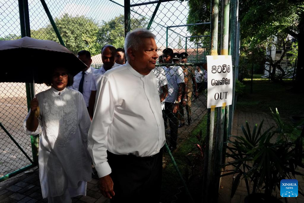 File photo taken on Sept. 21, 2024 shows Ranil Wickremesinghe (Front) leaving a polling station after casting his vote for the presidential election 2024 in Colombo, Sri Lanka. Former Sri Lankan president Ranil Wickremesinghe was arrested on Aug. 22, 2025 by the Criminal Investigation Department (CID) over alleged misuse of state funds, state media reported. (Xinhua/Wu Yue)