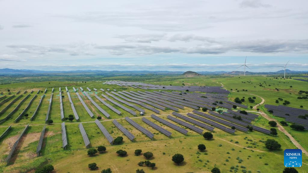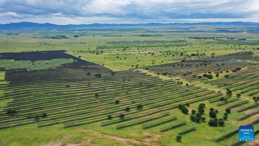An aerial drone photo taken on July 29, 2025 shows photovoltaic panels at the site of a desertification control project integrated with wind and solar power facilities in Horqin Right Wing Middle Banner of Hinggan League, north China's Inner Mongolia Autonomous Region. In recent years, Inner Mongolia has focused on the desertification control of the Horqin sandy land. The local authorities implemented projects integrating sand control and wind and solar power industries, establishing renewable energy facilities alongside afforestation and soil improvement efforts. (Xinhua/Ding He)
