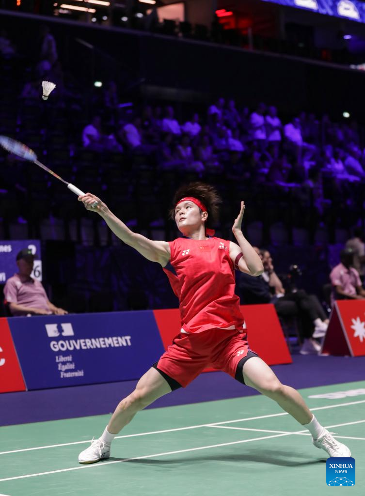 Wang Zhiyi of China hits a return during the women's singles first round match against Agnes Korosi of Hungary at the BWF World Championships 2025 in Paris, France, Aug. 26, 2025. (Xinhua/Zhang Fan)