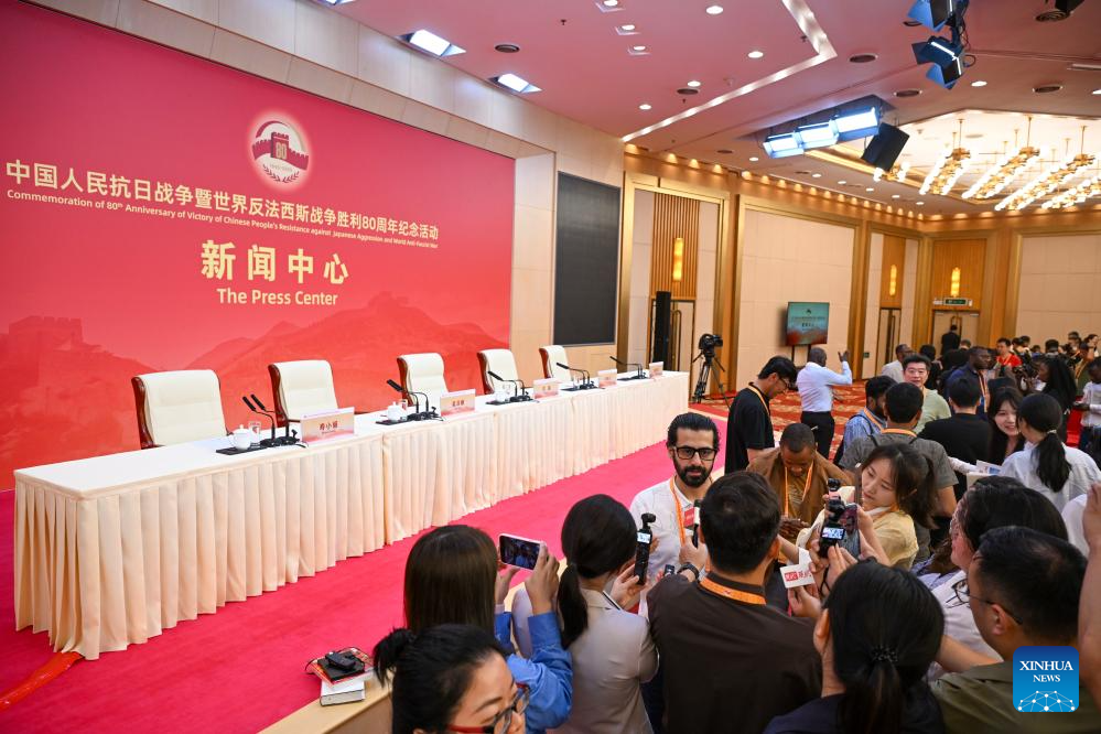 Journalists pose for a group photo at the press center of Commemoration of 80th Anniversary of Victory of Chinese People's Resistance against Japanese Aggression and World Anti-Fascist War in Beijing, capital of China, Aug. 28, 2025. The press center has opened here on Wednesday.