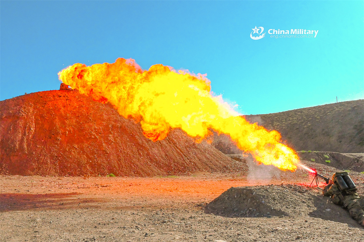 A soldier assigned to a brigade under the Chinese PLA Army ignites controlled fire with a flamethrower against a fire-proof wall during a live-fire training exercise on August 15, 2025. (eng.chinamil.com.cn/Photo by Liao Yixin)