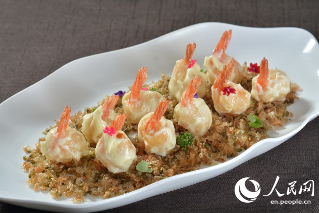 A fragrant creation made with ginseng, fresh shrimp and pagoda tree blossoms, lightly sweetened with honey for a perfect balance of crispiness on the outside and tenderness within at a restaurant in Tonghua, northeast China's Jilin Province. (Photo provided to People's Daily Online)