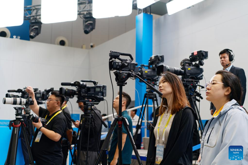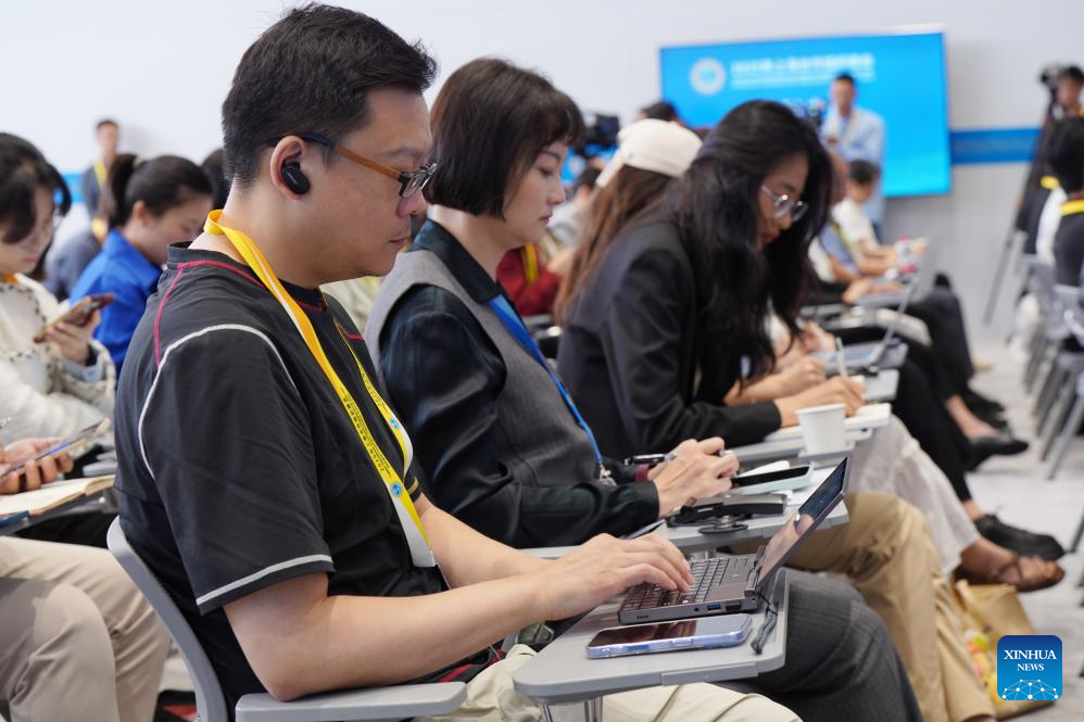 Journalists work during a press briefing of Good-Neighborliness, Friendship and Cooperation Commission (GNFCC) of the Shanghai Cooperation Organization (SCO) on SCO people-to-people exchanges and cooperation and the GNFCC's efforts to promote SCO people-to-people diplomacy at Tianjin Meijiang Convention Center in north China's Tianjin, Aug. 30, 2025. The press briefing was held here by the media center of SCO Summit 2025 on Saturday. (Xinhua/Zhang Xiaoyu)