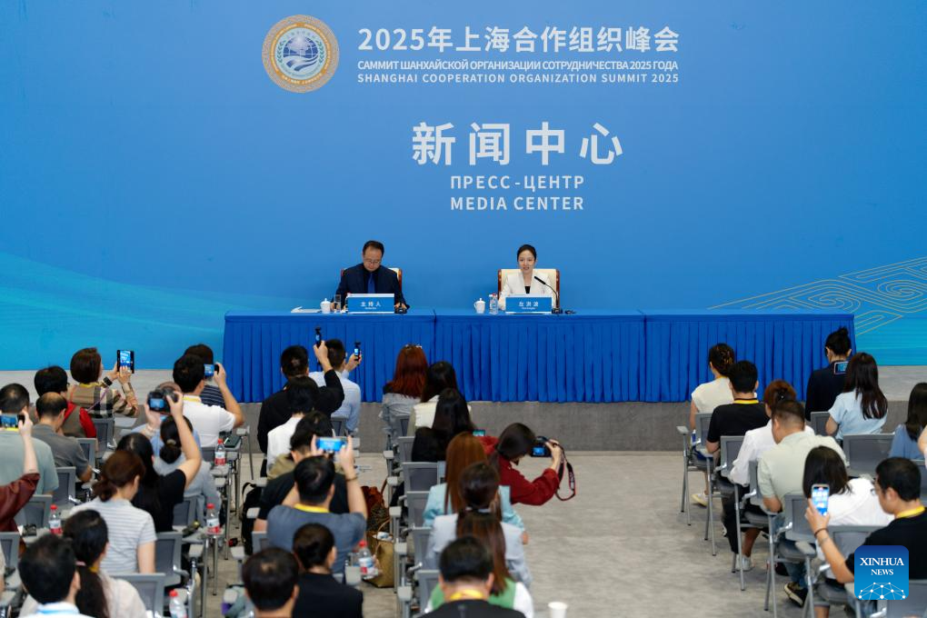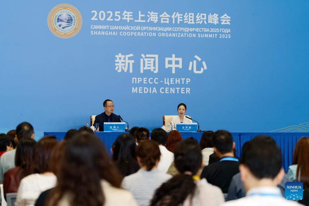 Zuo Hongbo (R, back), secretary general of Good-Neighborliness, Friendship and Cooperation Commission (GNFCC) of the Shanghai Cooperation Organization (SCO), speaks during a press briefing of GNFCC on SCO people-to-people exchanges and cooperation and the GNFCC's efforts to promote SCO people-to-people diplomacy at Tianjin Meijiang Convention Center in north China's Tianjin, Aug. 30, 2025. The press briefing was held here by the media center of SCO Summit 2025 on Saturday. (Xinhua/Zhang Xiaoyu)