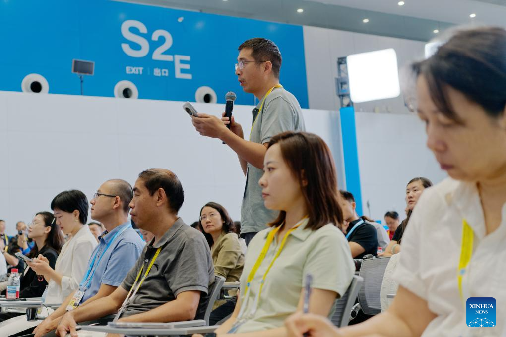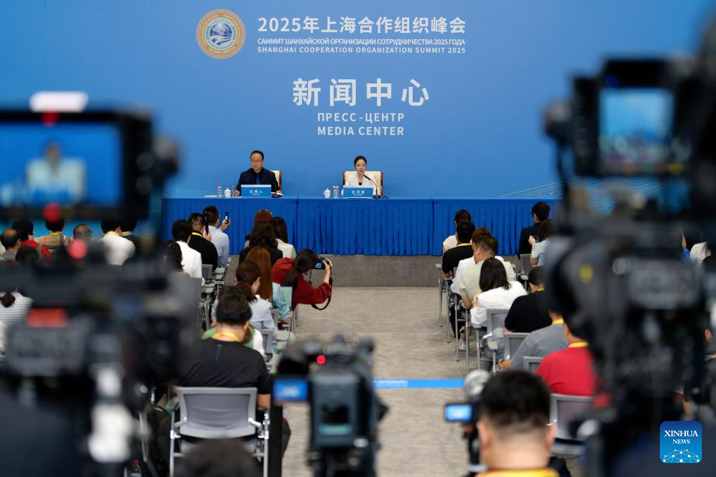 A Journalist asks questions during a press briefing of Good-Neighborliness, Friendship and Cooperation Commission (GNFCC) of the Shanghai Cooperation Organization (SCO) on SCO people-to-people exchanges and cooperation and the GNFCC's efforts to promote SCO people-to-people diplomacy at Tianjin Meijiang Convention Center in north China's Tianjin, Aug. 30, 2025. The press briefing was held here by the media center of SCO Summit 2025 on Saturday. (Xinhua/Zhang Xiaoyu)