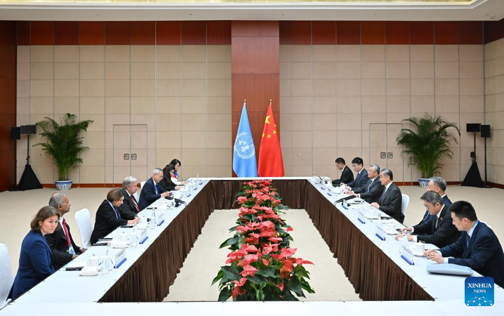 Chinese Foreign Minister Wang Yi, also a member of the Political Bureau of the Communist Party of China Central Committee, meets with United Nations (UN) Secretary-General Antonio Guterres in Tianjin, north China, Aug. 30, 2025. Guterres is here to attend the Shanghai Cooperation Organization (SCO) Summit 2025. (Xinhua/Yue Yuewei)