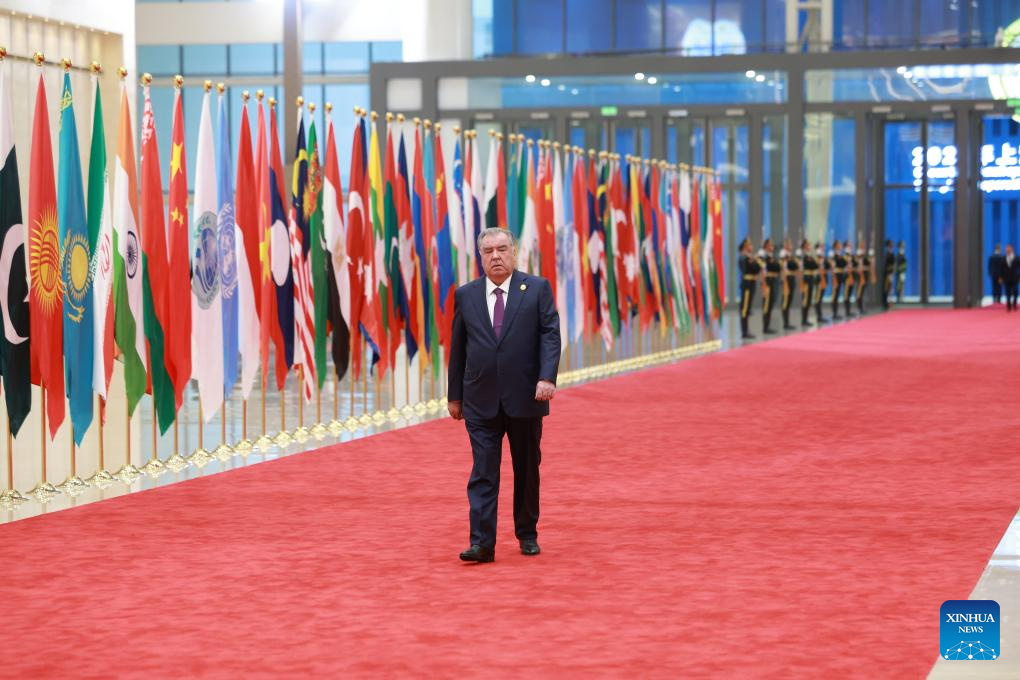 Tajik President Emomali Rahmon arrives at the Meijiang Convention and Exhibition Center for a welcoming banquet in Tianjin, north China, Aug. 31, 2025. Chinese President Xi Jinping and his wife, Peng Liyuan, on Sunday hosted a banquet in China's port city of Tianjin to welcome international guests who are here to attend the Shanghai Cooperation Organization (SCO) Summit 2025. (Xinhua/Ding Haitao)