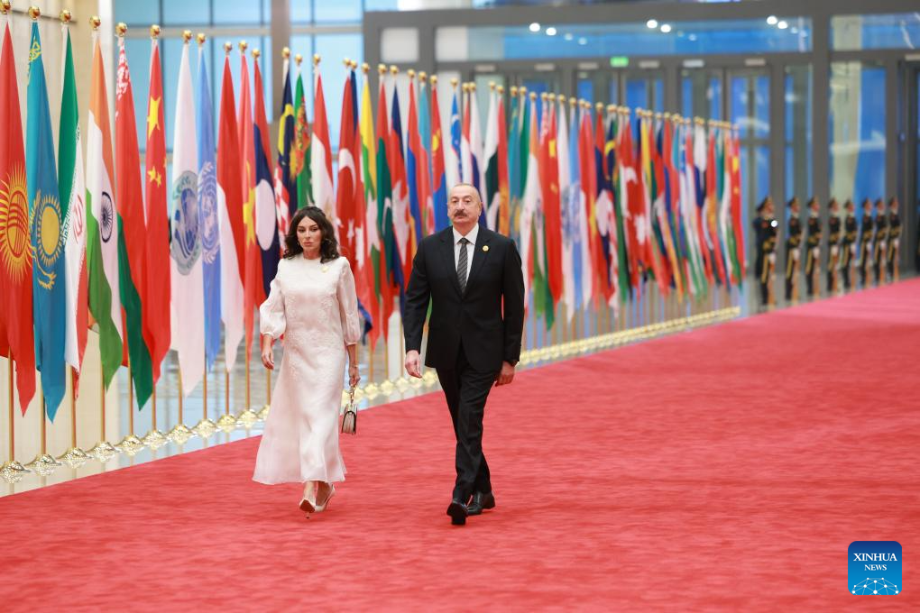 Azerbaijani President Ilham Aliyev and his wife arrive at the Meijiang Convention and Exhibition Center for a welcoming banquet in Tianjin, north China, Aug. 31, 2025. Chinese President Xi Jinping and his wife, Peng Liyuan, on Sunday hosted a banquet in China's port city of Tianjin to welcome international guests who are here to attend the Shanghai Cooperation Organization (SCO) Summit 2025. (Xinhua/Ding Haitao)