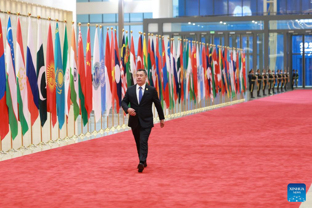 Kyrgyz President Sadyr Japarov arrives at the Meijiang Convention and Exhibition Center for a welcoming banquet in Tianjin, north China, Aug. 31, 2025. Chinese President Xi Jinping and his wife, Peng Liyuan, on Sunday hosted a banquet in China's port city of Tianjin to welcome international guests who are here to attend the Shanghai Cooperation Organization (SCO) Summit 2025. (Xinhua/Ding Haitao)