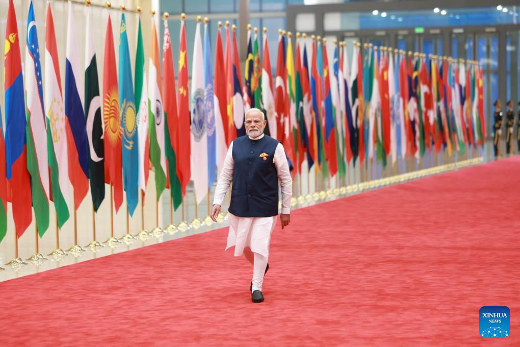 Indian Prime Minister Narendra Modi arrives at the Meijiang Convention and Exhibition Center for a welcoming banquet in Tianjin, north China, Aug. 31, 2025. Chinese President Xi Jinping and his wife, Peng Liyuan, on Sunday hosted a banquet in China's port city of Tianjin to welcome international guests who are here to attend the Shanghai Cooperation Organization (SCO) Summit 2025. (Xinhua/Ding Haitao)