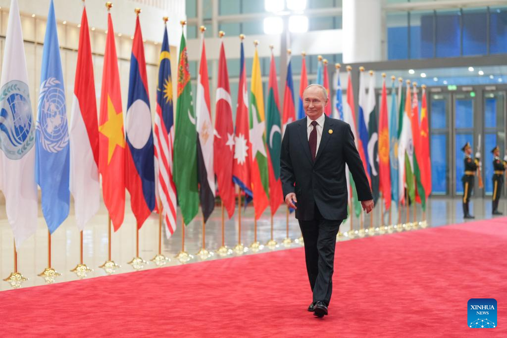 Russian President Vladimir Putin arrives at the Meijiang Convention and Exhibition Center for a welcoming banquet in Tianjin, north China, Aug. 31, 2025. Chinese President Xi Jinping and his wife, Peng Liyuan, on Sunday hosted a banquet in China's port city of Tianjin to welcome international guests who are here to attend the Shanghai Cooperation Organization (SCO) Summit 2025. (Xinhua/Li Yan)