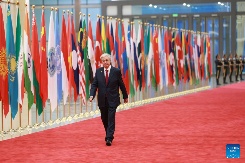 Kazakh President Kassym-Jomart Tokayev arrives at the Meijiang Convention and Exhibition Center for a welcoming banquet in Tianjin, north China, Aug. 31, 2025. Chinese President Xi Jinping and his wife, Peng Liyuan, on Sunday hosted a banquet in China's port city of Tianjin to welcome international guests who are here to attend the Shanghai Cooperation Organization (SCO) Summit 2025. (Xinhua/Ding Haitao)