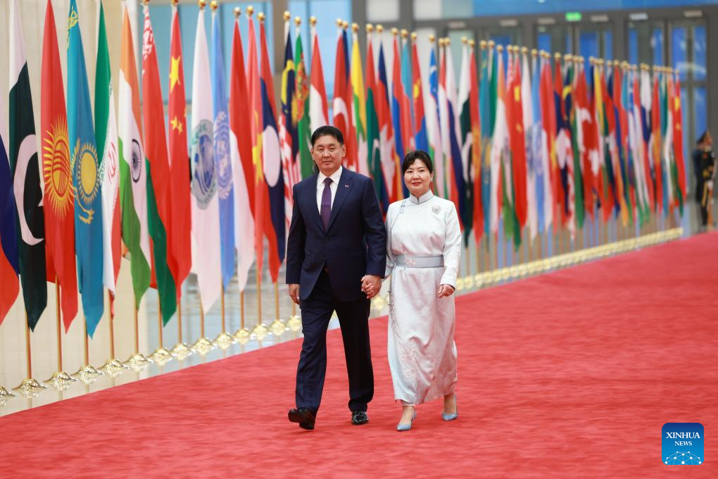 Mongolian President Ukhnaa Khurelsukh and his wife arrive at the Meijiang Convention and Exhibition Center for a welcoming banquet in Tianjin, north China, Aug. 31, 2025. Chinese President Xi Jinping and his wife, Peng Liyuan, on Sunday hosted a banquet in China's port city of Tianjin to welcome international guests who are here to attend the Shanghai Cooperation Organization (SCO) Summit 2025. (Xinhua/Ding Haitao)