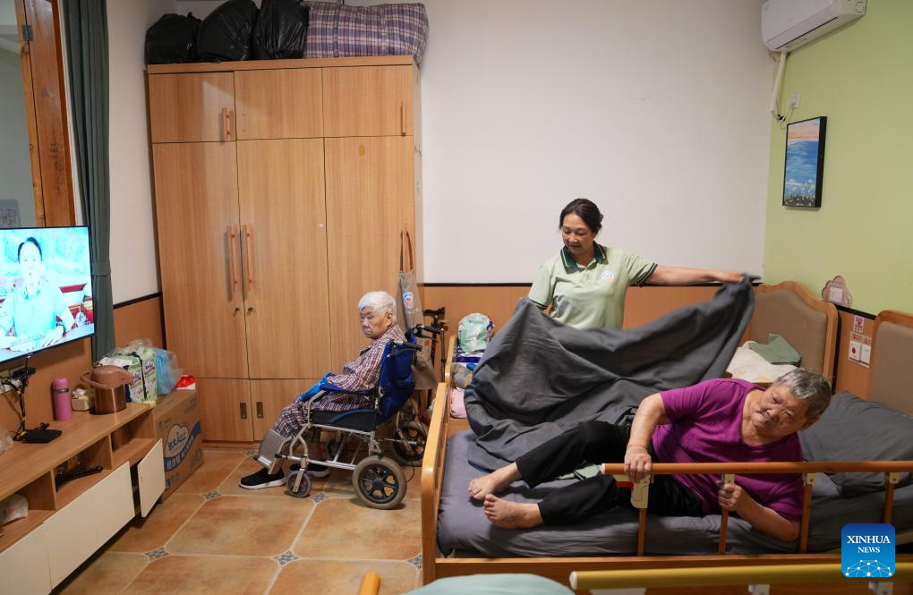 A staff member (C) takes care of senior residents at a comprehensive elderly care center in Yingmenkou subdistrict of Chengdu, southwest China's Sichuan Province, Sept. 1, 2025. The comprehensive elderly care center covers an area of 1,400 square meters and serves multiple residential communities. Supported by the government and run by enterprise management with social participation, this community-based elderly care complex offers full-time care, daycare, rehabilitation therapies, and professional nursing services. (Xinhua/Jiang Hongjing)