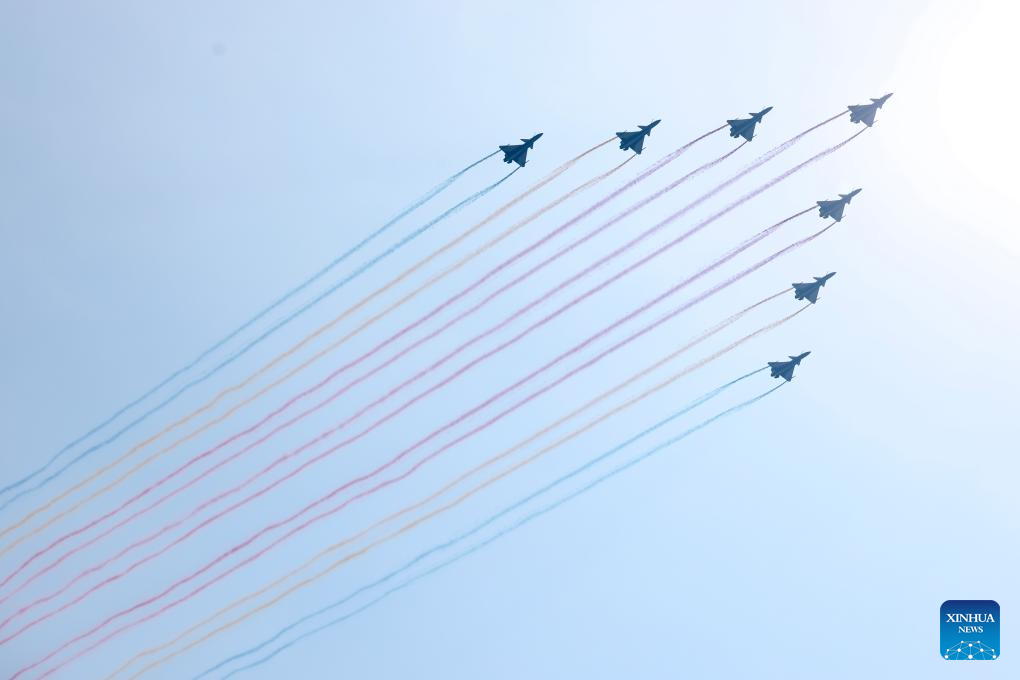 The echelon of trainer aircraft attends a parade during a grand gathering to commemorate the 80th anniversary of the victory in the Chinese People's War of Resistance against Japanese Aggression and the World Anti-Fascist War in Beijing, capital of China, Sept. 3, 2025. (Xinhua/Meng Yongmin)