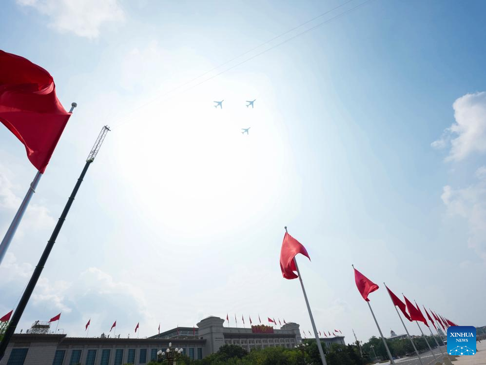 The bomber echelon flies over Tian'anmen Square during a military parade in Beijing, capital of China, Sept. 3, 2025. China on Wednesday held a grand gathering to commemorate the 80th anniversary of the victory in the Chinese People's War of Resistance against Japanese Aggression and the World Anti-Fascist War. (Xinhua/Liu Ying)