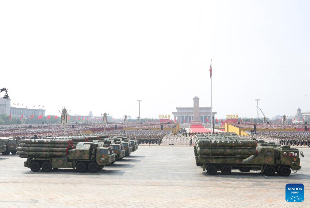 The air defense weaponry formation attends a military parade in Beijing, capital of China, Sept. 3, 2025. China on Wednesday held a grand gathering to commemorate the 80th anniversary of the victory in the Chinese People's War of Resistance against Japanese Aggression and the World Anti-Fascist War. (Xinhua/Yao Dawei)