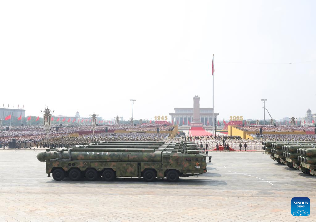 The hypersonic missile formation attends a military parade in Beijing, capital of China, Sept. 3, 2025. China on Wednesday held a grand gathering to commemorate the 80th anniversary of the victory in the Chinese People's War of Resistance against Japanese Aggression and the World Anti-Fascist War. (Xinhua/Liu Dawei)