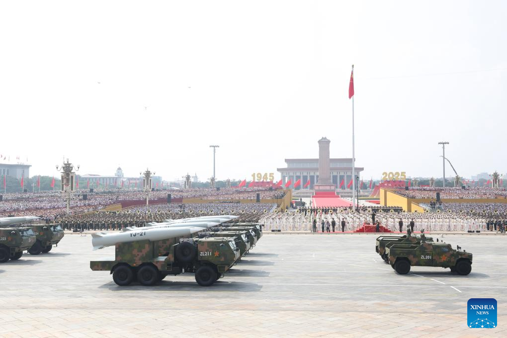 The air defense weaponry formation attends a military parade in Beijing, capital of China, Sept. 3, 2025. China on Wednesday held a grand gathering to commemorate the 80th anniversary of the victory in the Chinese People's War of Resistance against Japanese Aggression and the World Anti-Fascist War. (Xinhua/Chen Bin)