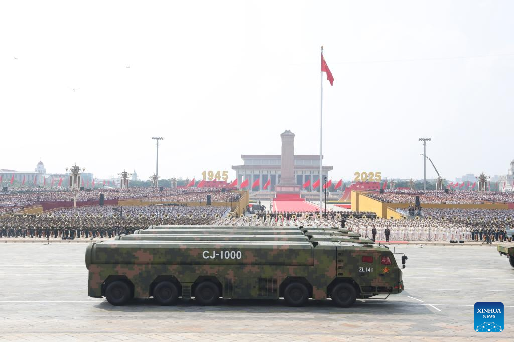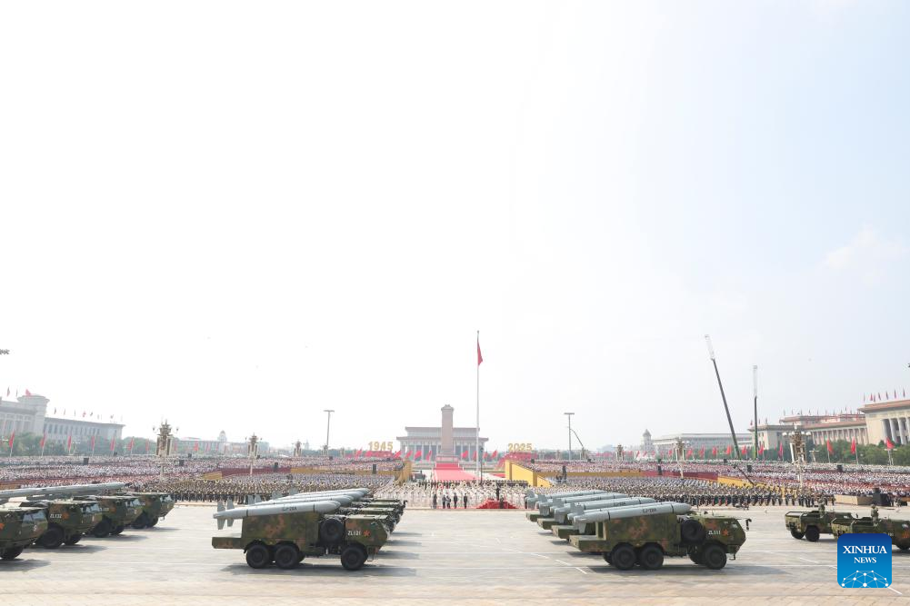 The hypersonic missile formation attends a military parade in Beijing, capital of China, Sept. 3, 2025. China on Wednesday held a grand gathering to commemorate the 80th anniversary of the victory in the Chinese People's War of Resistance against Japanese Aggression and the World Anti-Fascist War. (Xinhua/Liu Dawei)
