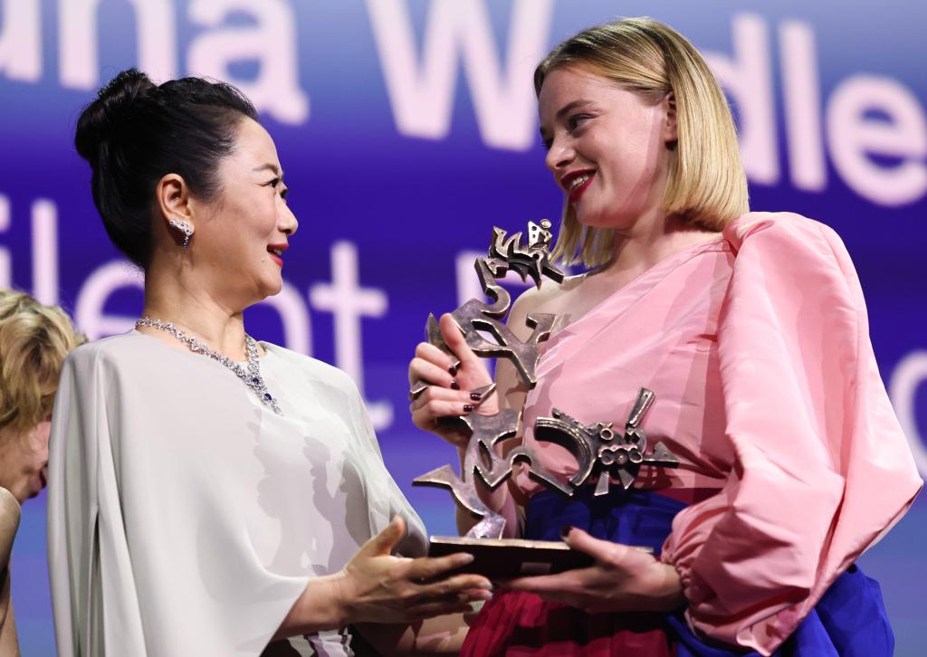Zhao Tao (L), a member of the 82nd Venice International Film Festival jury, presents the trophy to Luna Wedler of the film "Silent Friend" at the awarding ceremony of the 82nd Venice International Film Festival in Venice, Italy, Sept. 6, 2025. Luna Wedler in the film "Silent Friend" earned the Marcello Mastroianni Award for Best Young Actress Saturday night. (Xinhua/Li Jing)