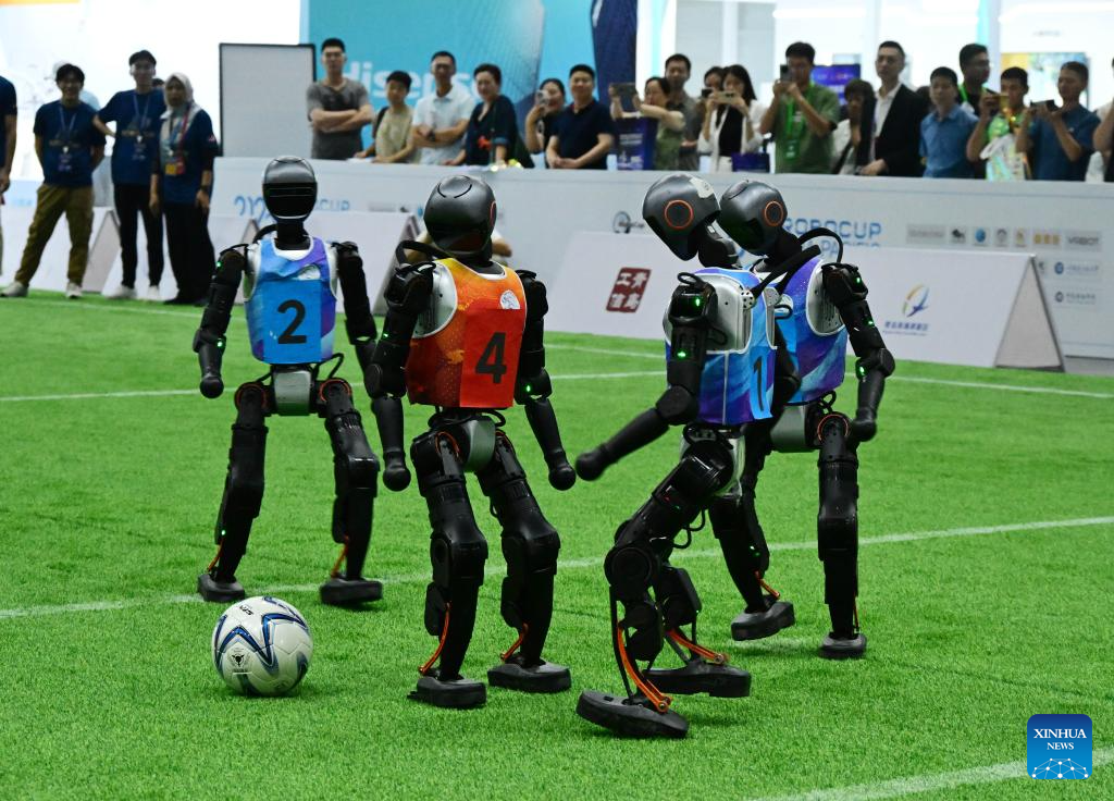 Robots compete during a soccer game of the 2025 Robot World Cup (RoboCup) Asia-Pacific Qingdao Invitational Tournament in Qingdao, east China's Shandong Province, Sept. 8, 2025. (Xinhua/Li Ziheng)