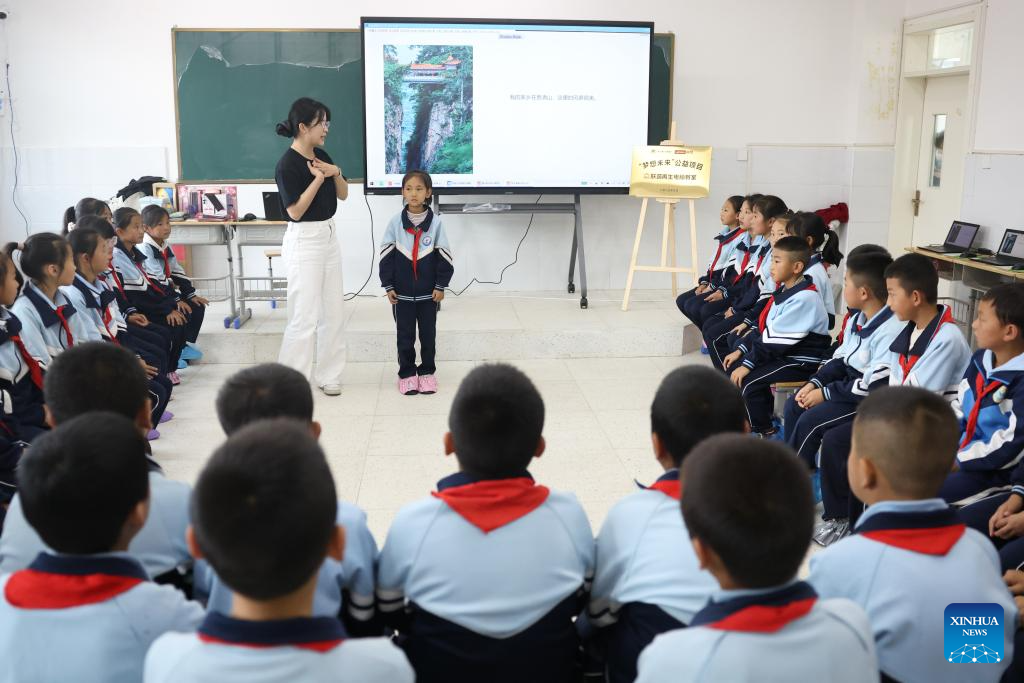 Children interact with a volunteer of China's multinational technology company Lenovo during an AI-themed lecture at Yanchuan school of Zhangxian County, Dingxi City of northwest China's Gansu Province, on Sept. 10, 2025. (Xinhua/Chen Bin)