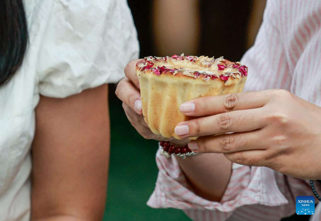 Rishit Himit displays a naan he made in Kuqa City, northwest China's Xinjiang Uygur Autonomous Region, July 21, 2025. (Xinhua/Wang Jingqiang)