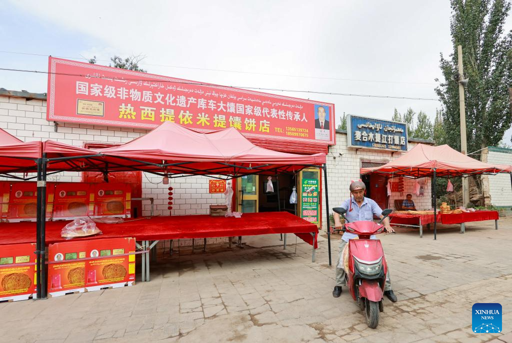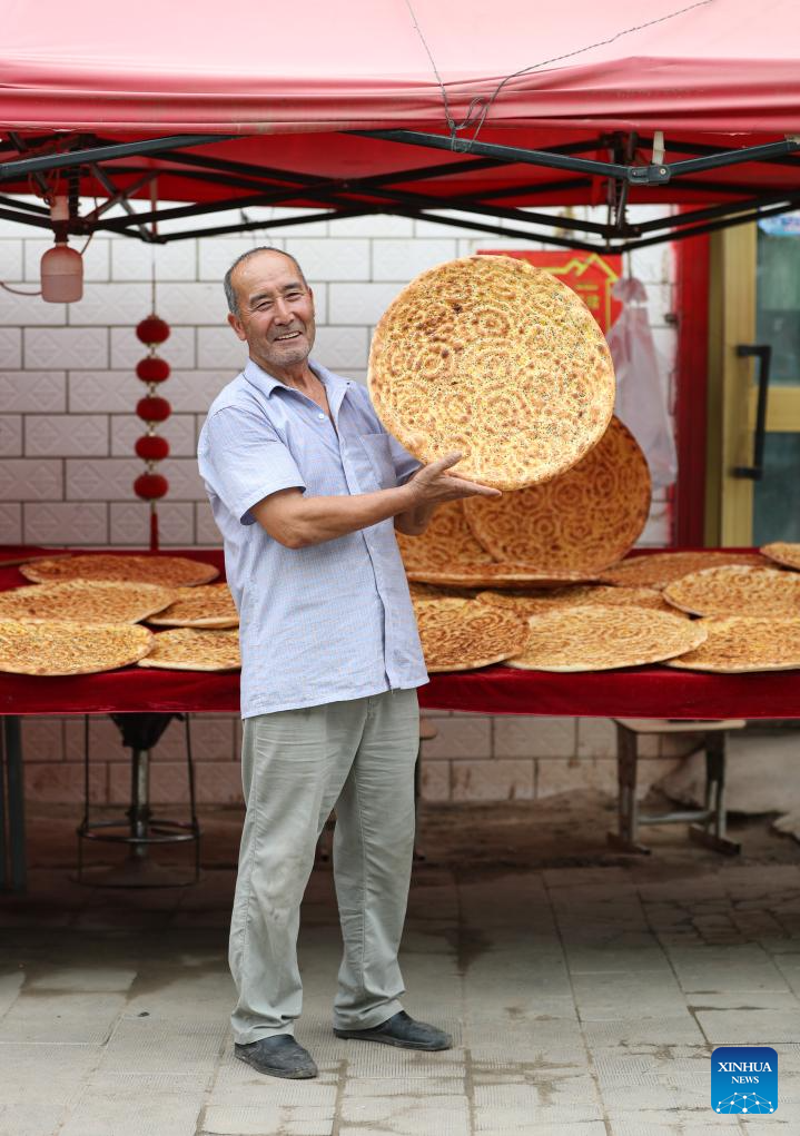 Rishit Himit sells naans at his store in Kuqa City, northwest China's Xinjiang Uygur Autonomous Region, July 22, 2025. (Xinhua/Wang Fei)