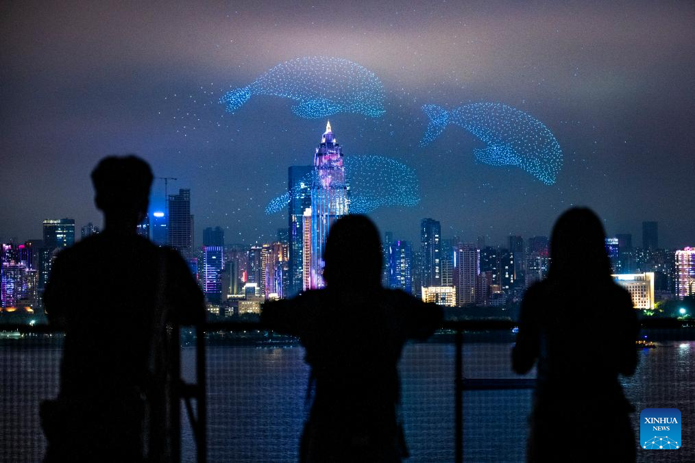 People view a drone performance during the opening ceremony of the 2025 Yangtze River cultural and arts season in Wuhan, central China's Hubei Province, Sept. 12, 2025. The opening ceremony of the 2025 Yangtze River cultural and arts season was held in Wuhan on Friday. The event will run from Sept. 12 to Oct. 30, featuring a range of activities including art exhibitions, film week, and music week. (Xinhua/Wu Zhizun)
